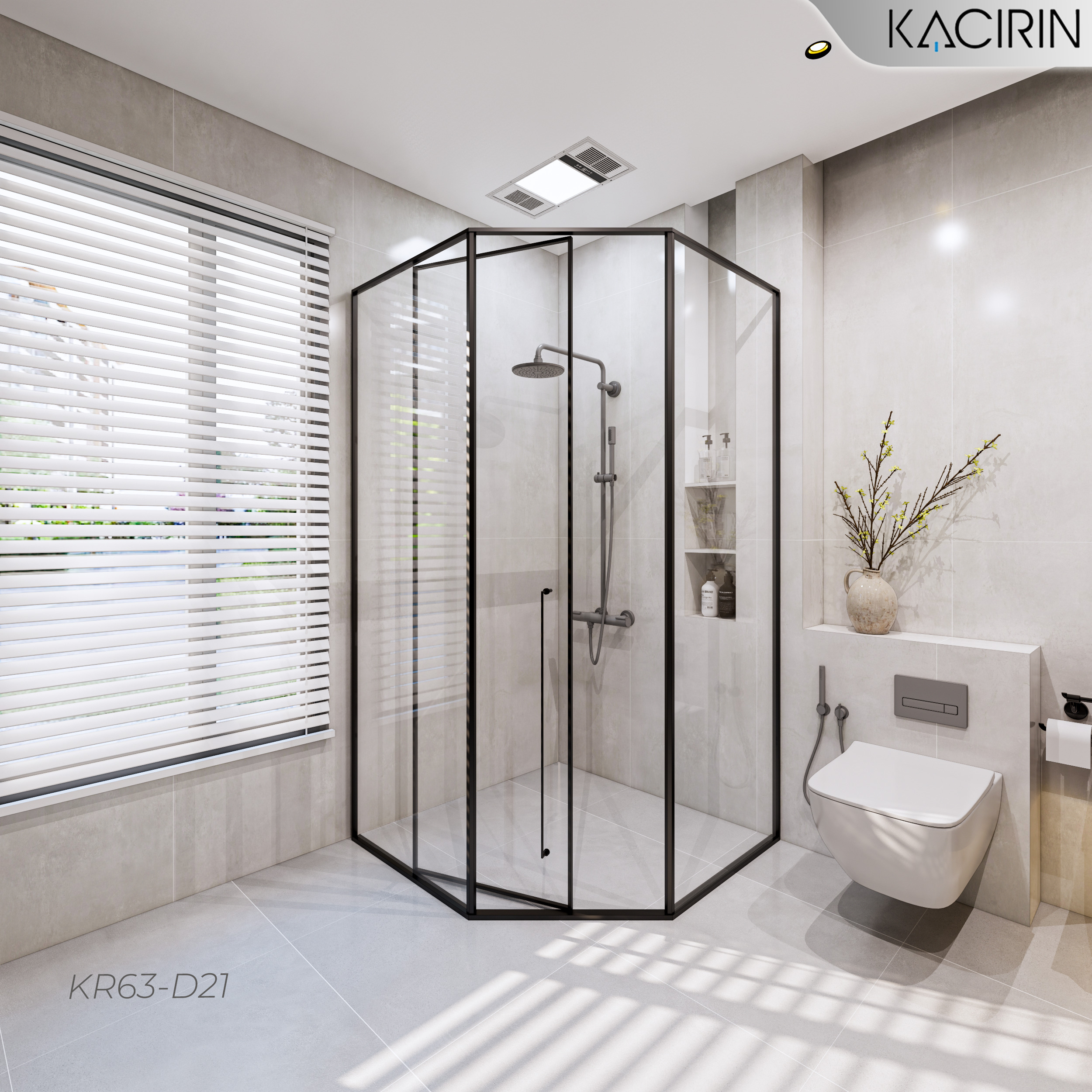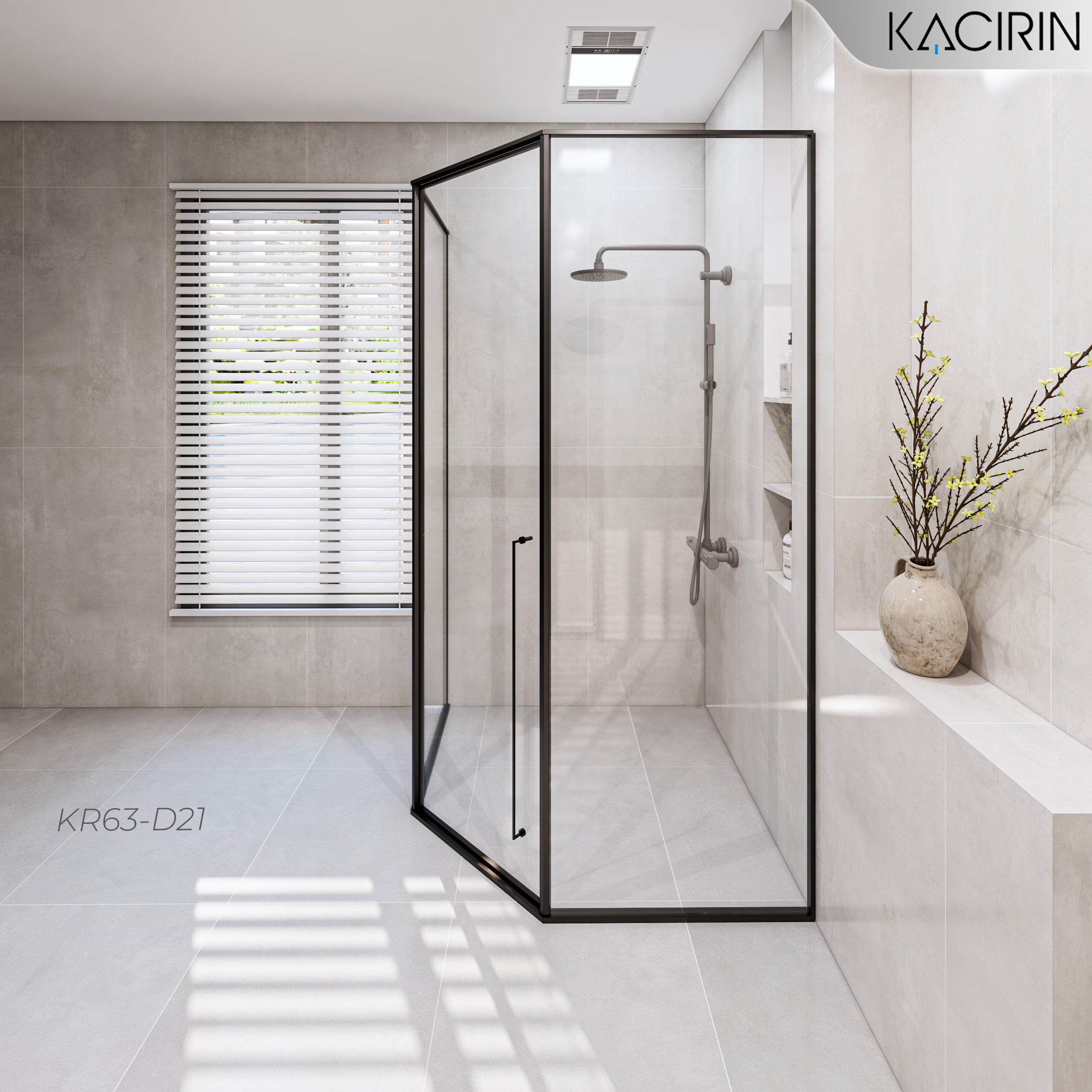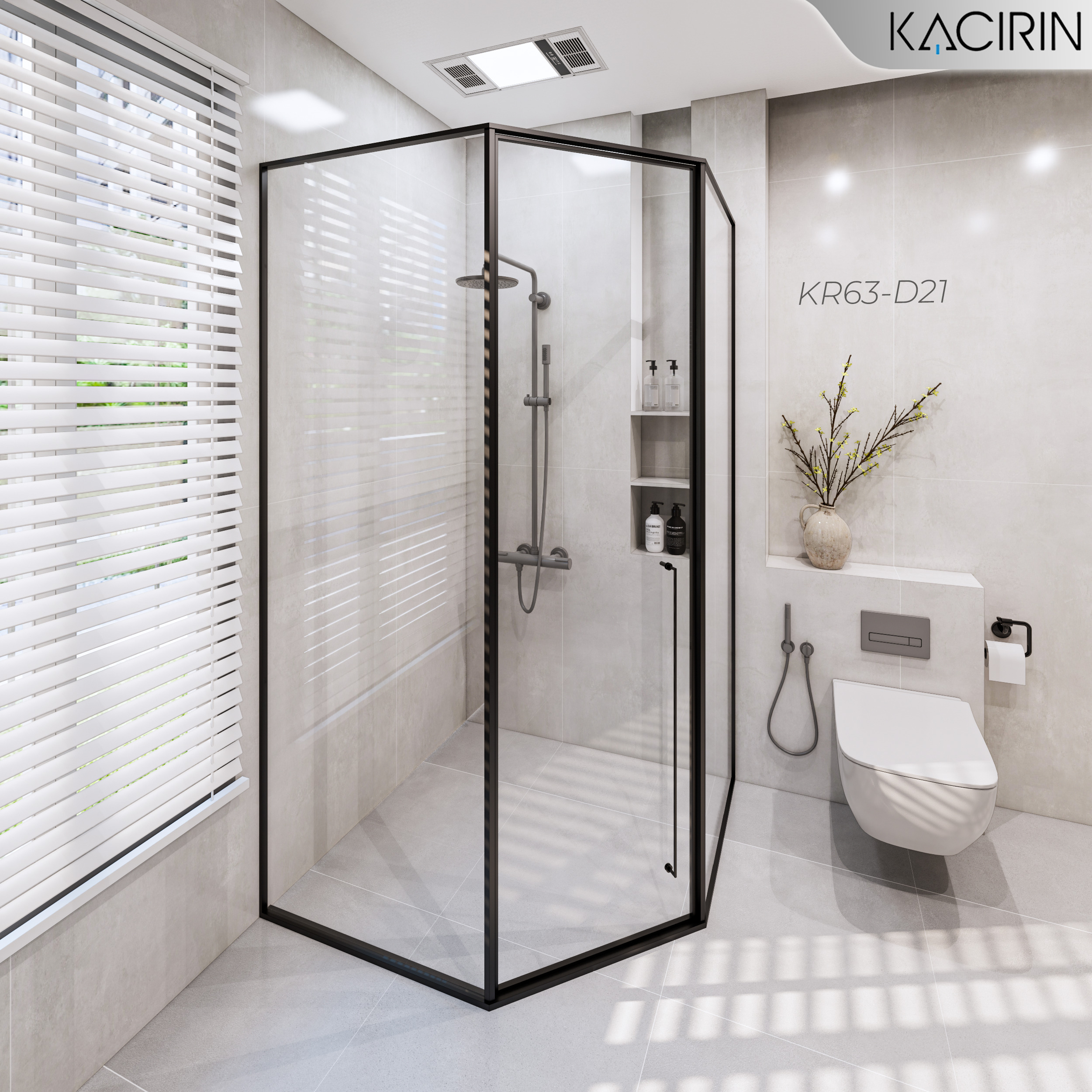 Tên sản phẩm: Cabin Tắm Kacirin mở quay góc 135 1 cánh + 2 vách cố định – Ẩn bản lề KR63-D21