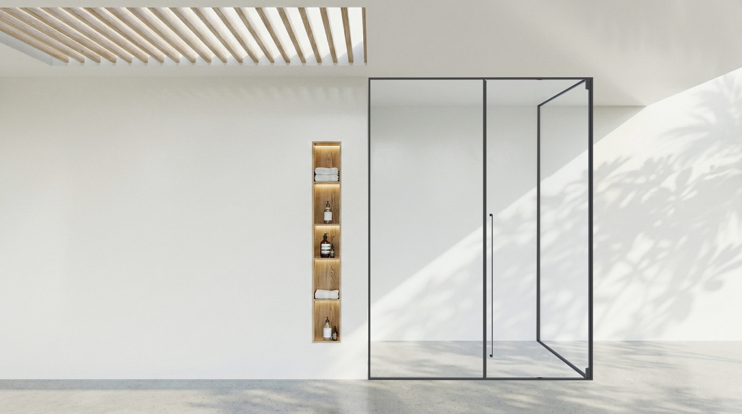 CABIN MỞ QUAY GÓC 90 1 CÁNH + 2 VÁCH CỐ ĐỊNH – DÁNG L